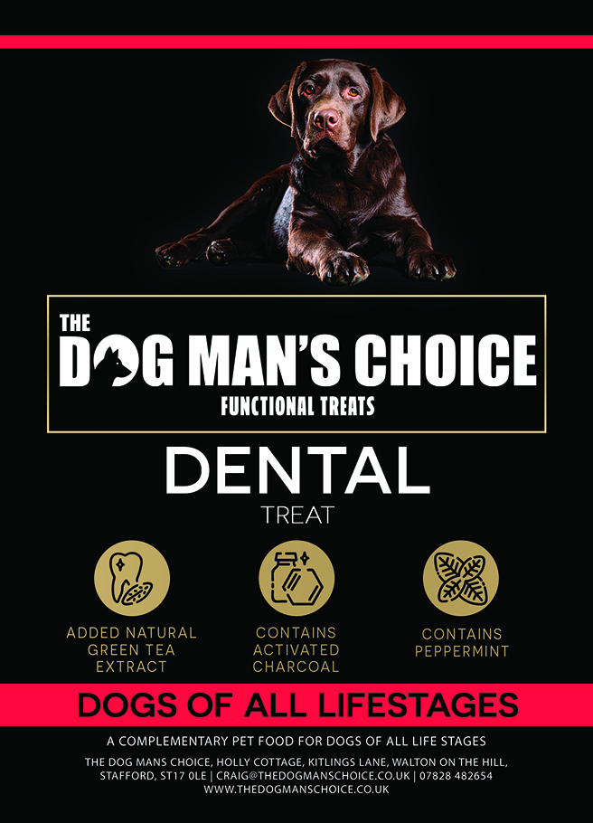 Grain-free dental dog treats with turkey, wild boar, charcoal, peppermint & green tea. Helps reduce tartar build-up and freshen breath from 12 weeks of age.